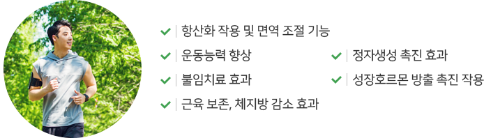 체내 산화질소 생성을 자극하여 혈관을 확장 시켜 줍니다. 확장된 혈관이 체내 순환을 도와 체지방 감소, 근육 생성에 도움을 줍니다.